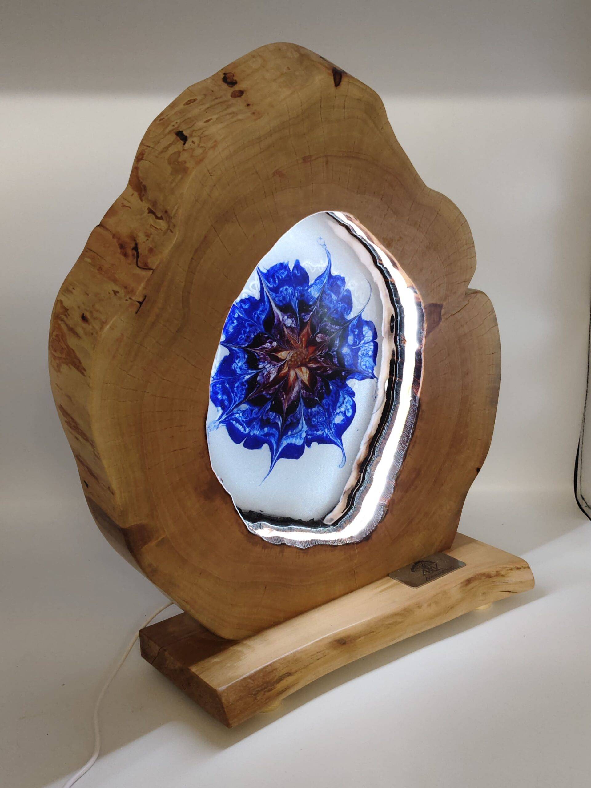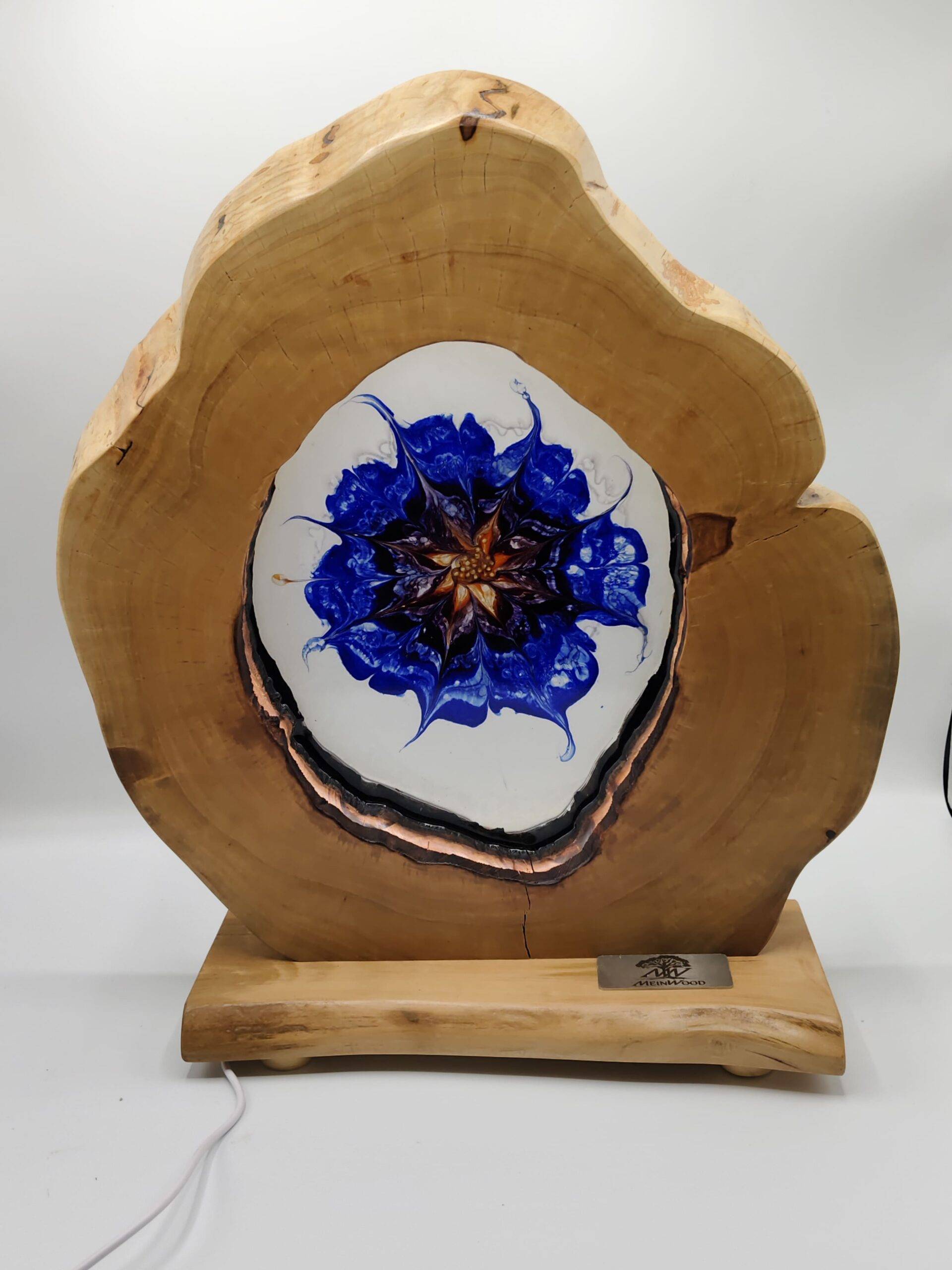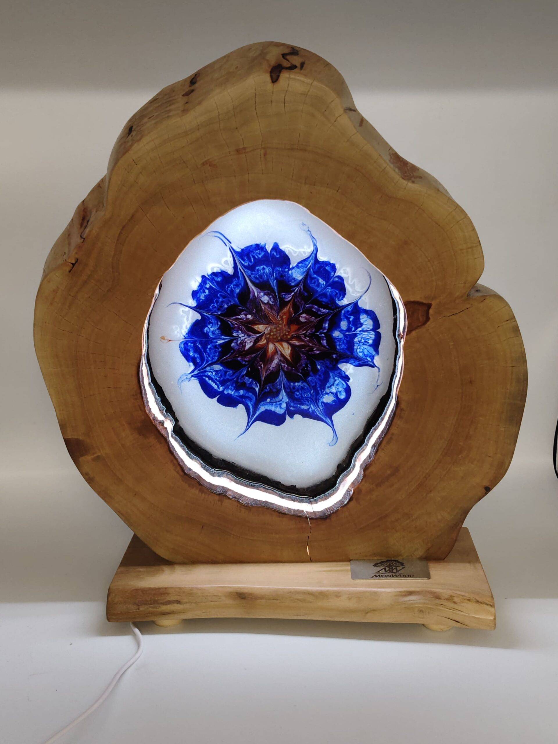 Für die ausgefallene Optik der Tischleuchte werden Beschädigungen und Löcher mit Kunstharz ausgegossen. Das Muster wird mit Harz und einer speziellen Technik mit verschiedenen Farben in mühevoller Handarbeit hergestellt. Durch sorgfältiges Schleifen und polieren der Oberfläche und die Behandlung mit natürlichen Ölen erhält die Tischleuchte einen seidigen Glanz und eine tolle, weiche Haptik. Gleichzeitig bietet diese Behandlung einen hervorragenden Schutz gegen äußere Einflüsse und ist äußerst stabil sowie unempfindlich.