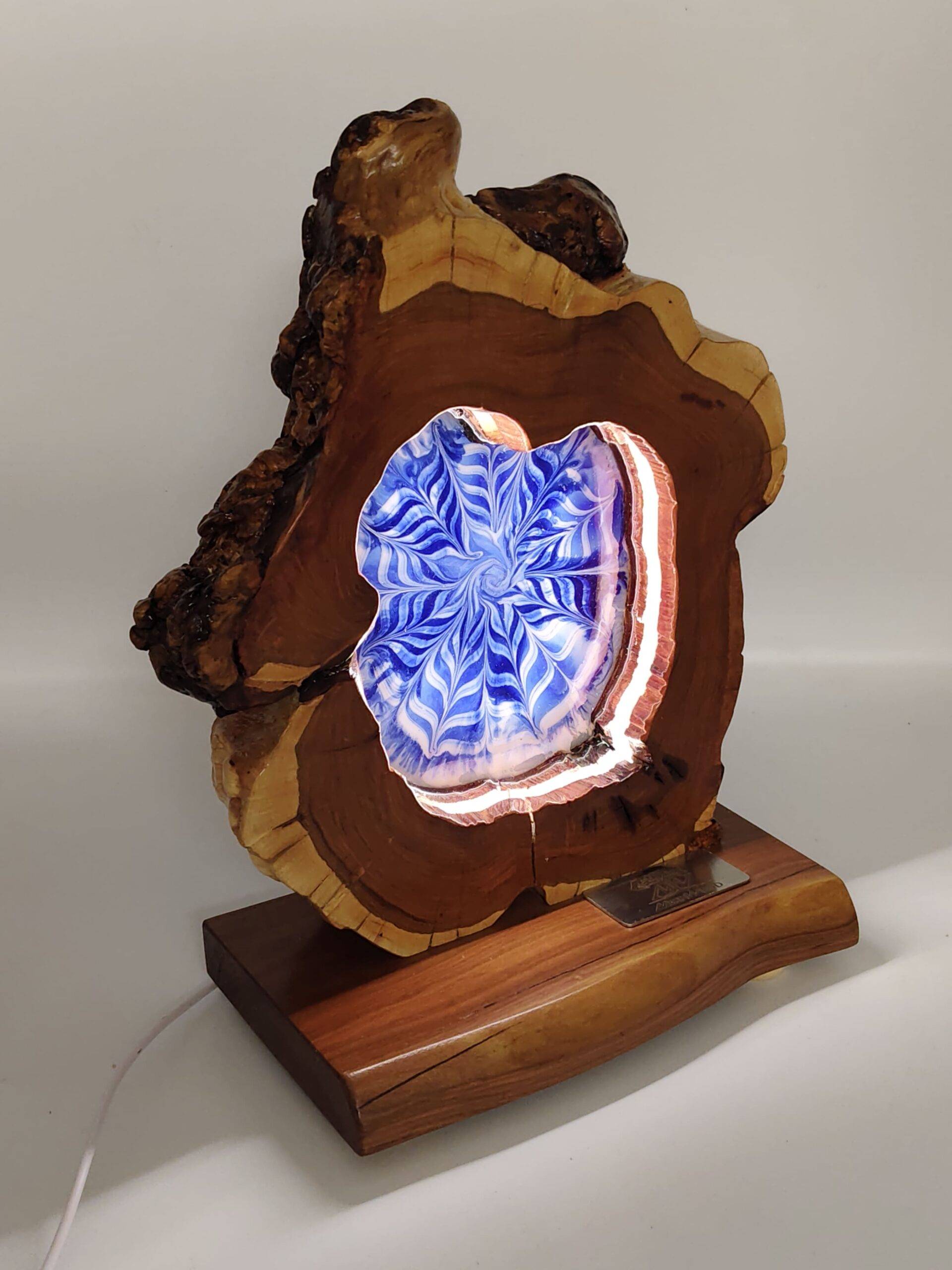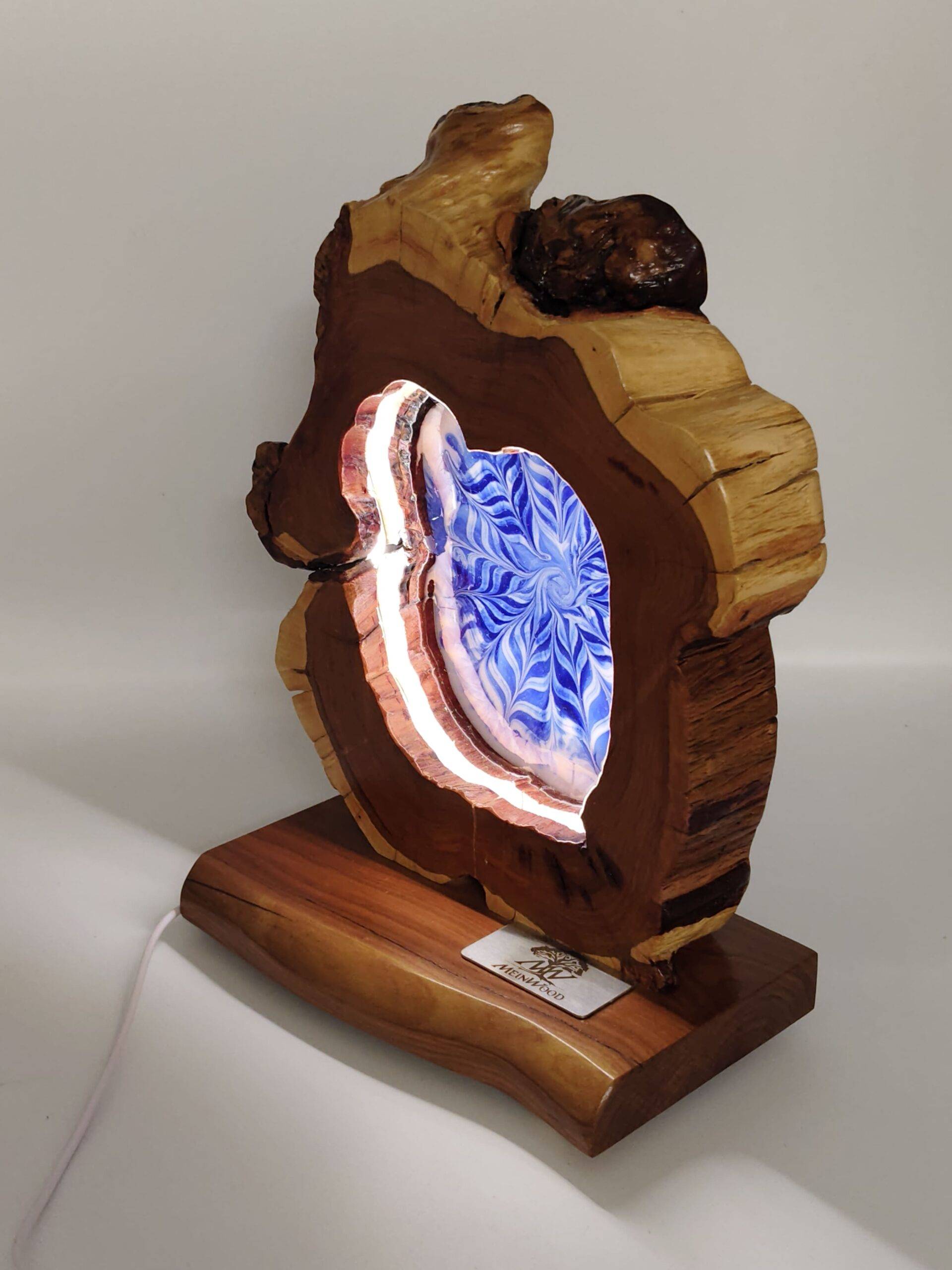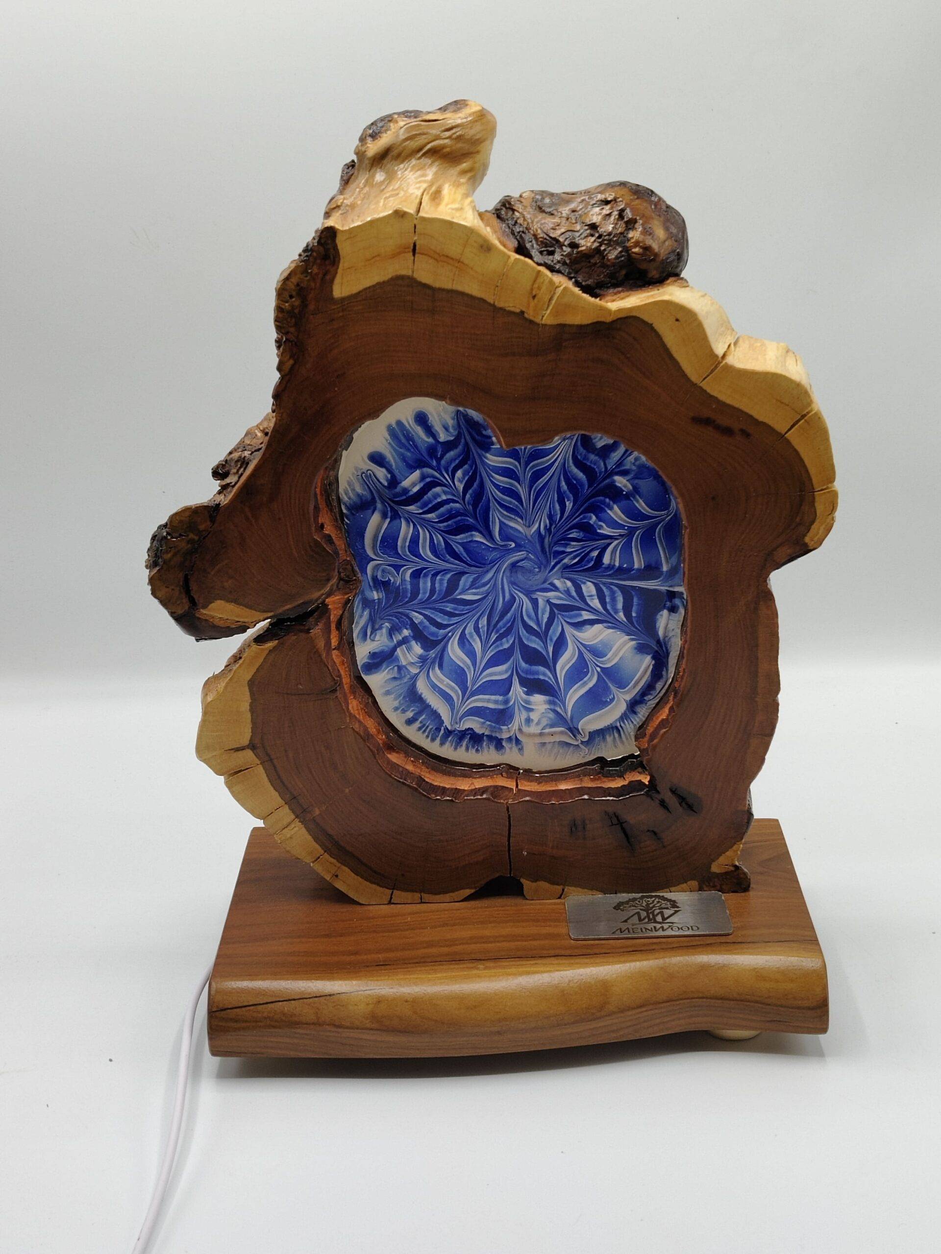 Für die ausgefallene Optik der Tischleuchte werden Beschädigungen und Löcher mit Kunstharz ausgegossen. Das Muster wird mit Harz und einer speziellen Technik mit verschiedenen Farben in mühevoller Handarbeit hergestellt. Durch sorgfältiges Schleifen und polieren der Oberfläche und die Behandlung mit natürlichen Ölen erhält die Tischleuchte einen seidigen Glanz und eine tolle, weiche Haptik. Gleichzeitig bietet diese Behandlung einen hervorragenden Schutz gegen äußere Einflüsse und ist äußerst stabil sowie unempfindlich.